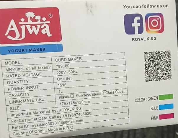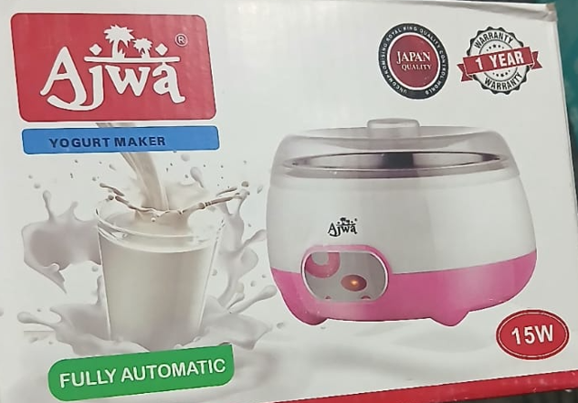 Prepare delicious homemade yogurt with ease using the Ajwa Yogurt Maker, a fully automatic curd maker designed for modern kitchens. Boasting a generous 1 liter capacity and a durable stainless steel liner, it ensures perfect results every time. The yogurt maker operates on 15W power and 220V~50Hz, making it efficient and reliable for daily use.