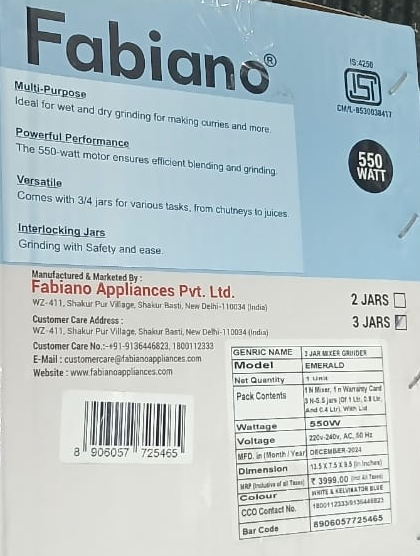 The Fabiano Emerald Mixer Grinder brings convenient and efficient blending, mixing, and grinding to your kitchen. Powered by a robust 550W motor, it ensures powerful performance for wet and dry grinding—perfect for preparing smoothies, curries, chutneys, and juices. The set comes with 3 high-quality stainless steel jars designed for multiple tasks and long-lasting durability.