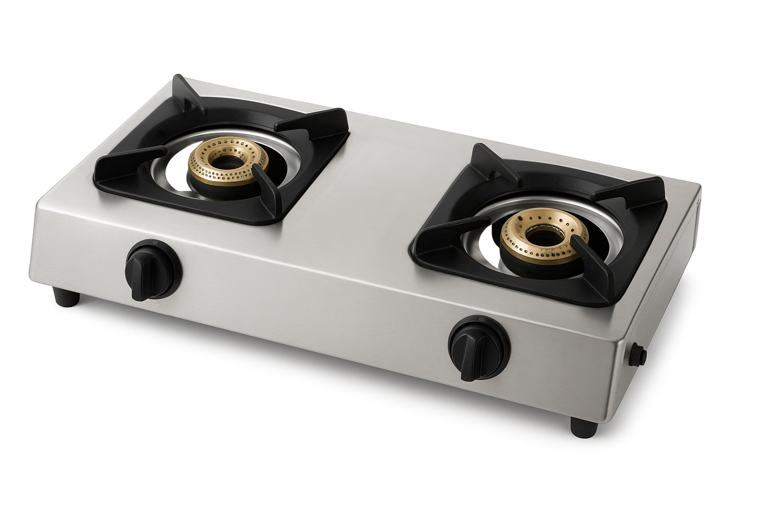 Efficient 2 burner steel gas stove with brass burners, ergonomic knobs, and durable pan supports for easy, safe, and even cooking.