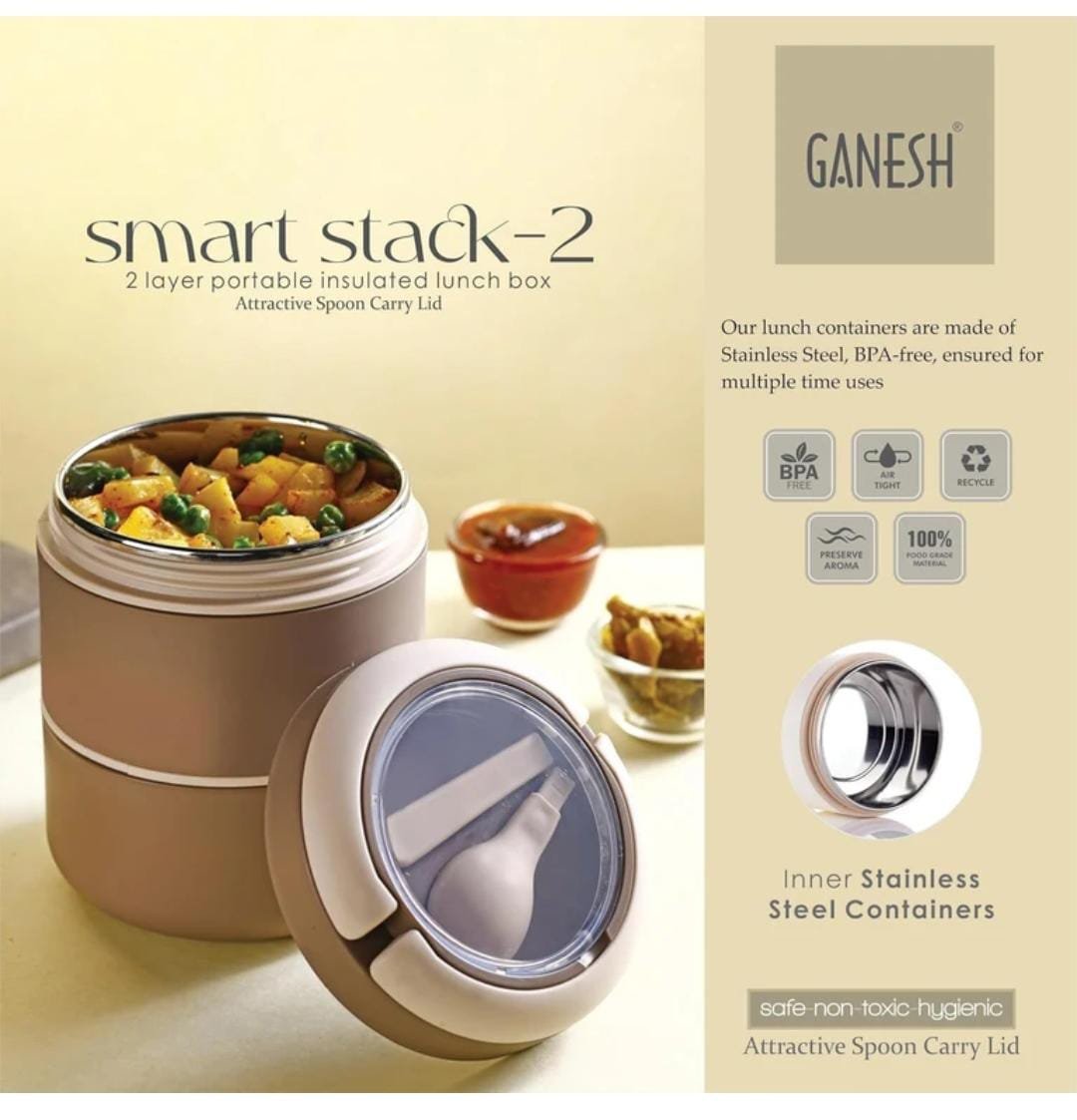 The Ganesh Smart Stack-2 is a modern two-layer portable insulated lunch box designed for convenience and freshness on the go. With double-wall insulation and inner stainless steel containers (each approx. 400ml), your meals stay warm and hygienic for hours. The set features a robust plastic carry handle, an attractive see-through lid with a foldable spoon, and special air vent leaks for safe transport of all kinds of food.