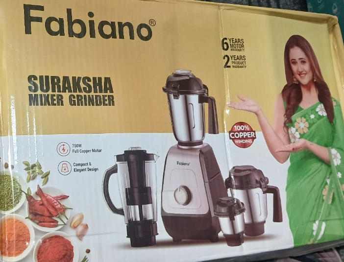 Fabiano Suraksha Mixer Grinder, 750W heavy-duty motor, 4 stainless steel jars, sharp blades, 3-speed control, powerful and compact for all kitchen needs.