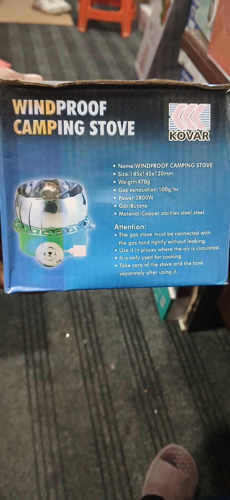 Fueled by butane canisters, this compact stove offers quick boiling, simmering, and steaming. It features safety instructions, including secure gas tank connection, use only in ventilated areas, and careful separation of stove and tank after use. With its size of 145x145x120mm, the Kovar stove is ideal for hiking, backpacking, and emergency kits, making on-the-go cooking both safe and hassle-free.